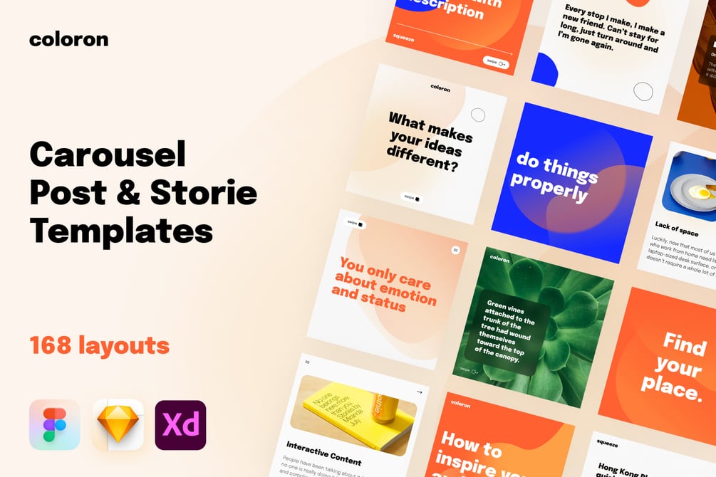 Create incredible and unique Instagram posts and stories with Coloron. It's a creative social media pack created for use in Figma and Sketch. Tell your story, teach, and show any information through creative 168 easy to edit layouts for Instagram.