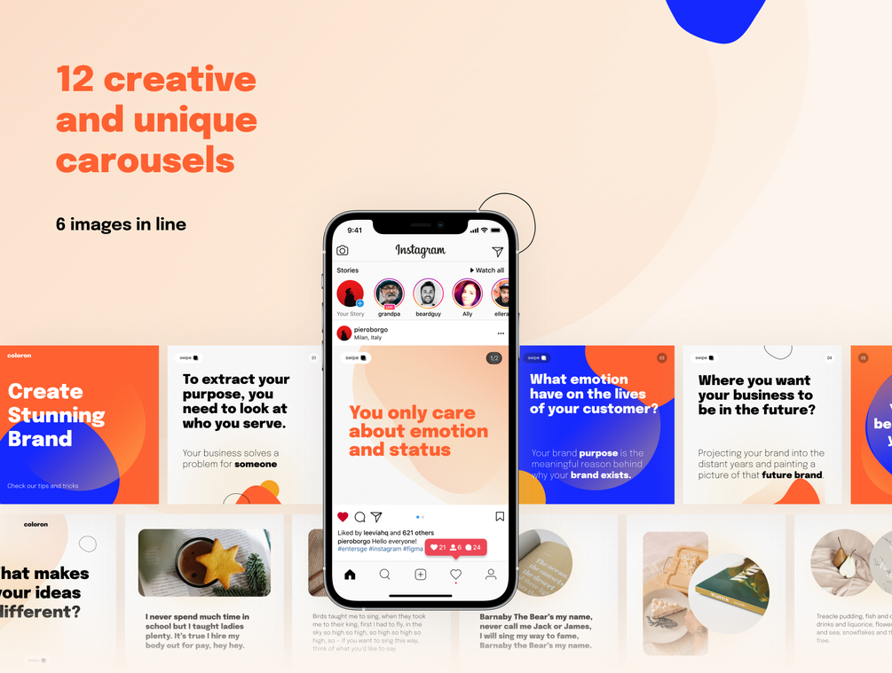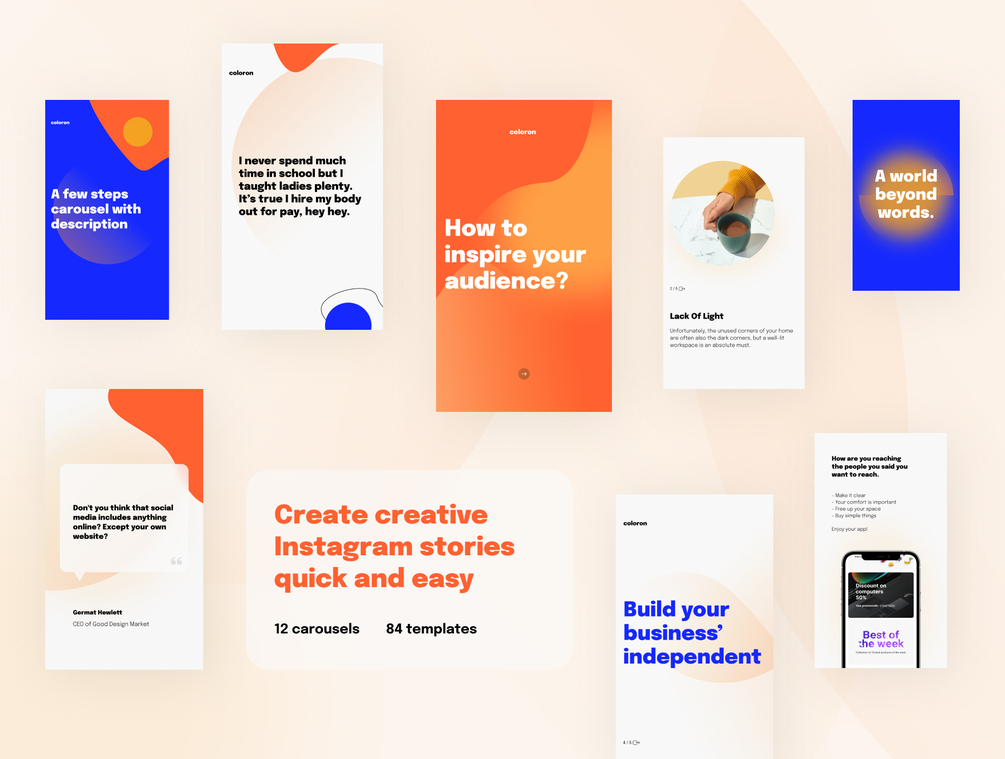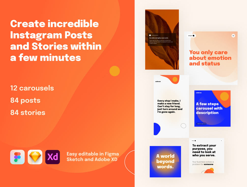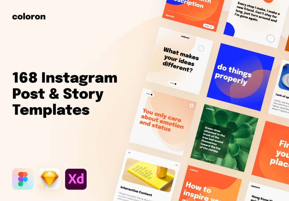Create incredible and unique Instagram posts and stories with Coloron. It's a creative social media pack created for use in Figma, Sketch, and Adobe XD. Tell your story, teach, and show any information through creative 168 easy-to-edit layouts for Instagram.